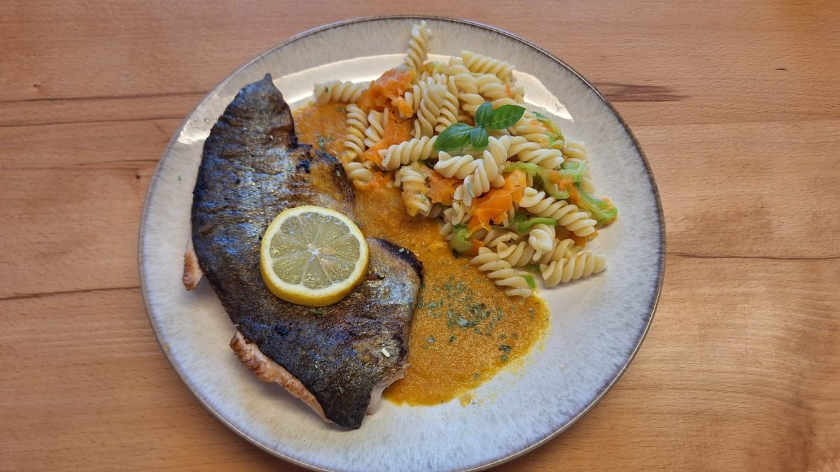 Ofen auf 160oC vorheizen. Lachsfilet abtupfen und zitronieren. Würzen, mit Thymian in ein Backpapier packen und für ca. 15-20 Minuten in den Ofen geben.